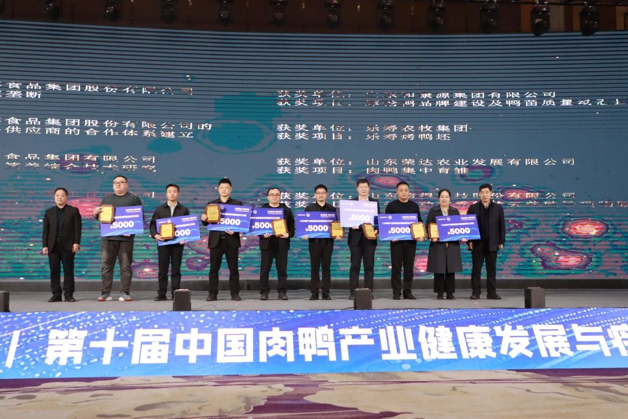 為推動肉鴨產業轉型升級、突破發展瓶頸,在中國肉鴨產業健康發展與疾病防控高峰論壇十周年之際,信得科技特別組織了肉鴨產業高質量發展創新成果征集和評選活動。活動自啟動以來,受到了行業的廣泛關注,收到二十家企業提交的37項創新項目。經過組織方與專家評審委員會的嚴格評審,最終評選出一等獎1名、二等獎3名、三等獎8名以及優秀提案獎9名。獲獎項目涵蓋技術創新、品牌創新、組織創新、管理創新、產品創新等維度,充分展示了近年來肉鴨產業在高質量發展道路上的創新實踐和突出成就。其中,實體平臺“鴨高創(山東)咨詢有限公司”的創立榮獲一等獎,該公司由益客、信得科技等9 家企業于2023年聯合出資組建,公司以整合資源、優勢互補、互惠互助、產業合力、高質量發展為核心理念,致力于打造一個產業協同平臺,通過技術創新與升級,為中國肉鴨產業的高質量健康發展提供強大助力。截至目前,有14項基礎研究,35項速贏項目,30余項應用驗證以及一批中長期研發項目已經或正在實施推進,取得了明顯的產業經濟效益。此外,益客集團的肉鴨 0 日齡流感漿膜炎聯合免疫的推廣、新泰天信農牧的家禽智慧籠養技術應用、河南旭瑞公司的黃河土鴨品牌建設等三個項目榮獲二等獎;益客集團的育種打破壟斷、動保戰略供應商的合作體系建立、中新食品的商品肉鴨籠養綜合技術研究、圣灃食品的肉鴨無抗生素養殖、和康源集團的庫倫鴨品牌建設及鴨苗質量動態監測、樂壽農牧的樂壽烤鴨坯、山東榮達農業的肉鴨集中育雛、以及信得科技的基于自動稱重的牧云養殖管理物聯網平臺等8個項目榮獲三等獎。