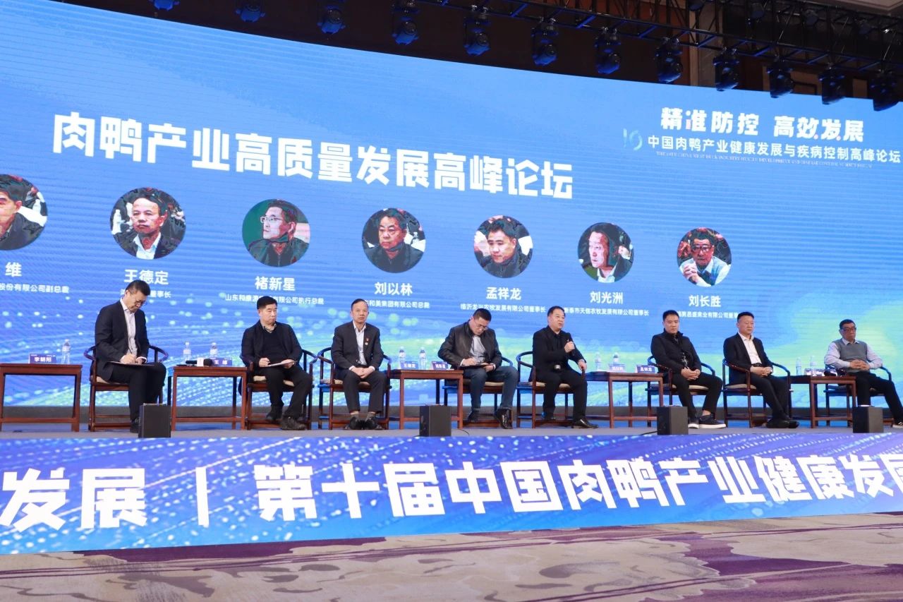 為讓肉鴨行業同仁深入了解和學習當前肉鴨產業的創新技術,會議特別邀請本次“十年肉鴨產業高質量發展創新成果”的企業代表河南旭瑞公司朱軍勝就黃河土鴨品牌建設、圣灃食品集團李志中就肉鴨無抗養殖、以及天信農牧李寧就家禽智慧籠養技術的應用進行了分享,為行業同仁提供了極具價值的參考和借鑒,更為肉鴨產業高質量發展注入了創新活力。在由李朝陽董事長主持的高峰論壇上,益客集團副總裁王維、鴻潤集團董事長王德定、和康源集團執行總裁褚新星、和美集團總裁劉以林、臨沂龍興農牧董事長孟祥龍、天信農牧董事長劉光洲、昌盛禽業董事長劉長勝,圍繞“產業鏈條各環節如何更好地協作”、“肉鴨養殖端如何發展創新”、“肉鴨產業如何高質量發展”等議題展開深入討論。與會嘉賓結合自身豐富的企業管理經驗和對行業的敏銳洞察,深入剖析了當前肉鴨產業面臨的挑戰與機遇。提出了加強技術創新、提升養殖管理水平,加強上下游溝通協作,實現資源共享與優勢互補等產業高質量發展路徑。