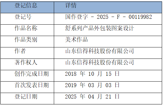 尊敬的各界人士:在此鄭重聲明,“舒系列” 產(chǎn)品外包裝設(shè)計(jì)圖案屬于美術(shù)作品范疇,其著作權(quán)歸山東信得科技股份有限公司獨(dú)家所有。該系列美術(shù)作品憑借獨(dú)特的設(shè)計(jì)理念和藝術(shù)表達(dá),旨在為 “舒系列” 產(chǎn)品打造鮮明且獨(dú)具辨識(shí)度的視覺(jué)形象,進(jìn)而提升產(chǎn)品在市場(chǎng)中的競(jìng)爭(zhēng)力。山東信得科技股份有限公司在創(chuàng)新發(fā)展的進(jìn)程中,始終將知識(shí)產(chǎn)權(quán)保護(hù)視為關(guān)鍵環(huán)節(jié)。此次 “舒系列” 產(chǎn)品外包裝設(shè)計(jì)圖案的美術(shù)作品登記,是對(duì)公司創(chuàng)新成果的有力捍衛(wèi),同時(shí)也是公司堅(jiān)持創(chuàng)新驅(qū)動(dòng)發(fā)展戰(zhàn)略的生動(dòng)體現(xiàn)。現(xiàn)將作品登記相關(guān)信息公示如下: