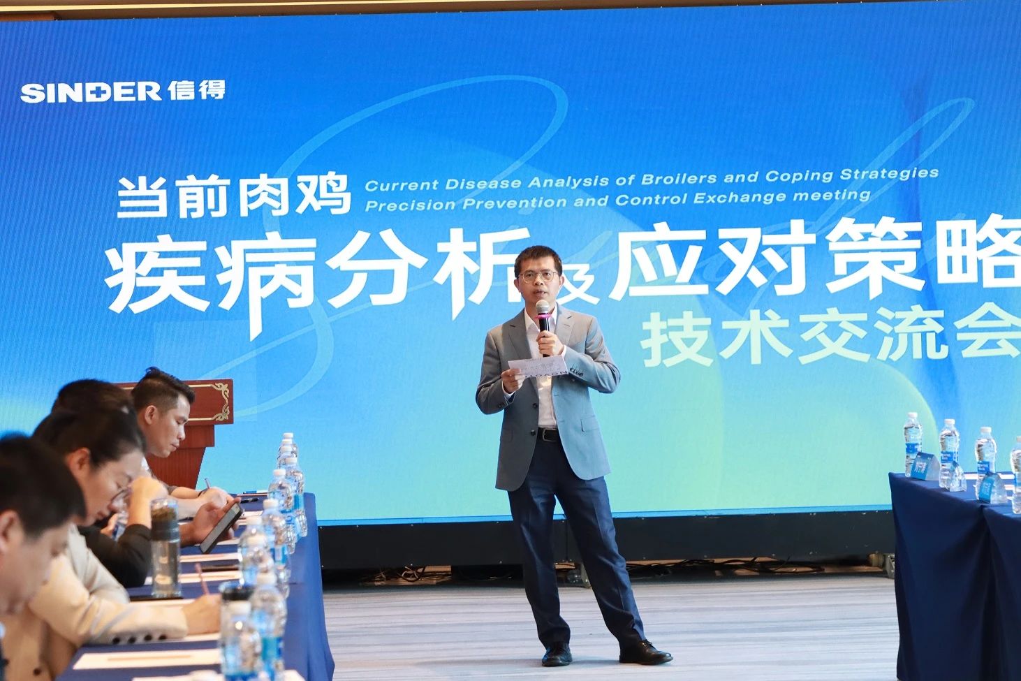 隨著養殖產業化和規模化發展,疫病傳播風險和防控難度加劇,免疫抑制性疾病高發,腿病、雞源鴨疫、支堵及禽流感等問題突出,嚴重影響肉雞的健康生長與出欄成績,給養殖業帶來巨大經濟損失。為支持行業伙伴及時掌握疫病流行情況,精準防控動物疫病,提高肉雞養殖效益,5月18日,正值中國畜牧業博覽會在青島召開之際,由信得科技組織的“當前肉雞疾病分析及應對策略的技術交流會”在山東青島舉行。來自三十余家企業的50余位行業專家、企業高管齊聚本次會議,為肉雞健康養殖,提質增效獻智獻策。