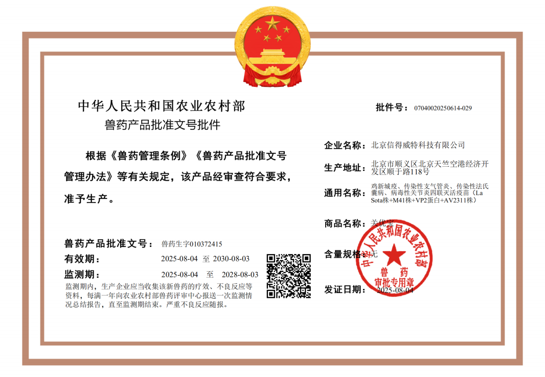 2025年8月4日,北京信得威特科技有限公司的雞新城疫、傳染性支氣管炎、傳染性法氏囊病、病毒性關節炎四聯滅活疫苗(LaSota株+M41株+VP2蛋白+AV2311株),正式獲得農業農村部獸藥產品批準文號。
