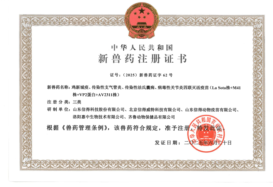 根據《獸藥管理條例》和《獸藥注冊辦法》規定,農業農村部經審查,批準山東信得科技股份有限公司、北京信得威特科技有限公司、山東信得動物疫苗有限公司與其他單位聯合申報的“雞新城疫、傳染性支氣管炎、傳染性法氏囊病、病毒性關節炎四聯滅活疫苗(La Sota株+M41株+VP2蛋白+AV2311株)”為新獸藥,并于2025年6月20日核發了《新獸藥注冊證書》。