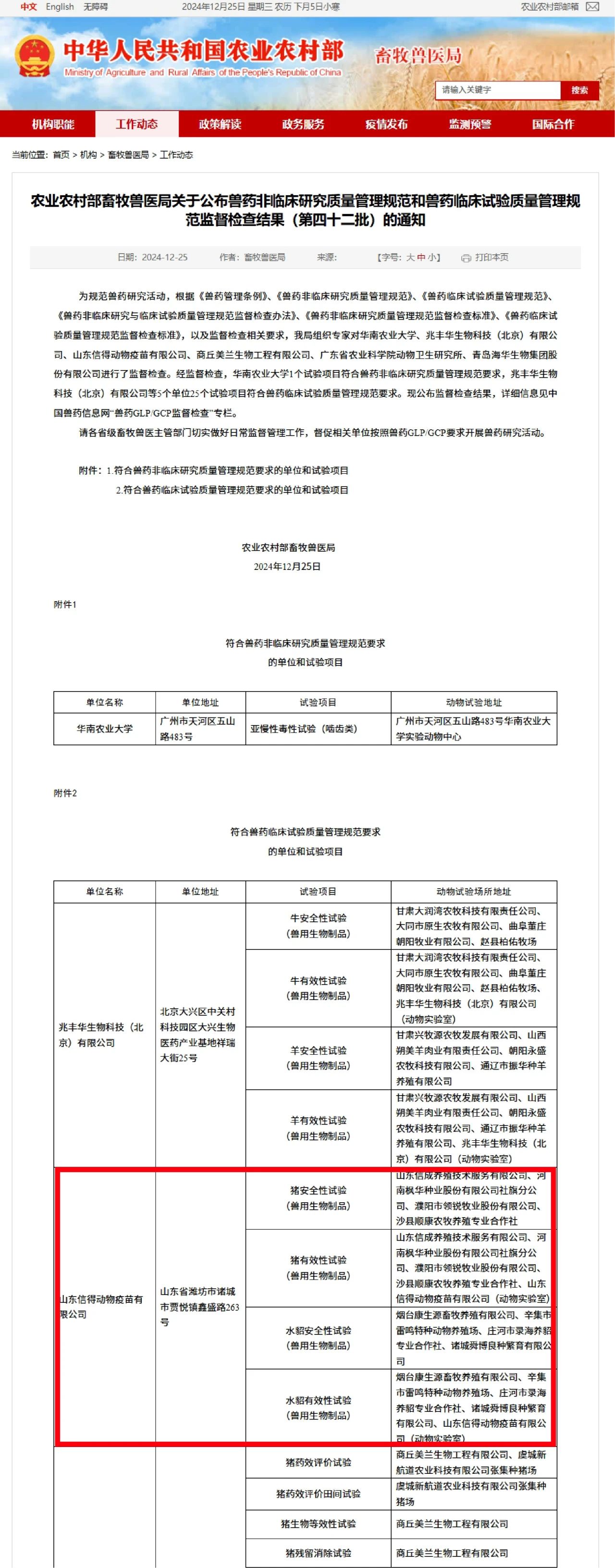 2024年11月21日至22日,農(nóng)業(yè)農(nóng)村部畜牧獸醫(yī)局組織監(jiān)督檢查專家組對(duì)山東信得動(dòng)物疫苗有限公司實(shí)施獸藥臨床試驗(yàn)質(zhì)量管理規(guī)范(獸藥GCP)現(xiàn)場(chǎng)監(jiān)督檢查。此次檢查項(xiàng)目為豬安全性試驗(yàn)(獸用生物制品)和有效性試驗(yàn)(獸用生物制品)、水貂安全性試驗(yàn)(獸用生物制品)和有效性試驗(yàn)(獸用生物制品)。